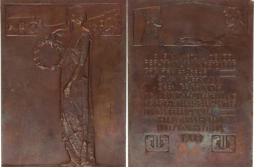 Jubilejní výstava obvodu obchodní a živnostenské komory pražské - Svým účastníkům a spoluprcovníkům 1908, česko-němec. nápisy / Sto jící žena s věncem v pravé ruce vzhlíží na panor. Prahy sign.: Fr. Mára Cu 64x89 mm