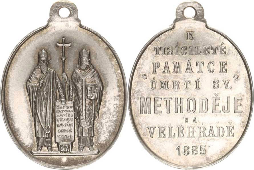 K tisícileté památce úmrtí Sv.Metoděje na Velehradě 1885, osmi řádkový nápis / stojící Sv.Cyril a Metoděj Ag 24x29 orig. ražené ouško Burian 75