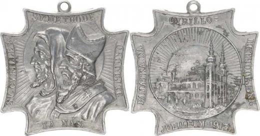 Památka na Cyrilo-Metodějské jubileum 1913, chrám / sv. Cyril a Metoděj Al 30x30 mm orig.raž. ouško Burian 119