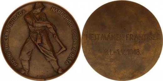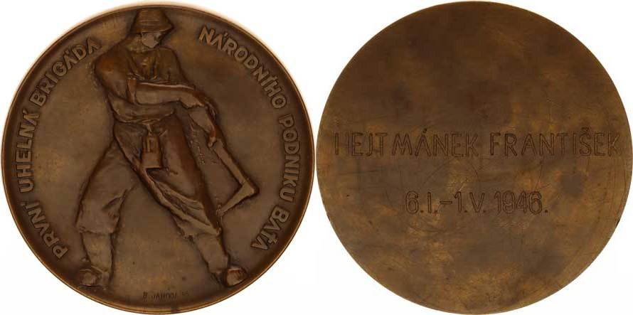 První uhelná brigáda Národního podniku BAŤA, postava horníka a op is / doryto: Hejtmánek František 6.1.-1.V. 1946 sign.: B. Jahod a bronz 60 mm pův. etue