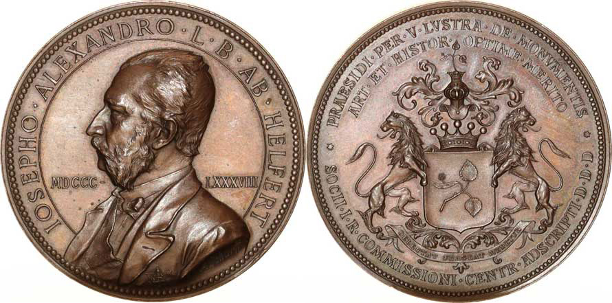 Josef Alexander Helfert - 25. výročí státního úředníka 1888, Port rét zleva / Rodový znak Cu 50 mm Hauser 7439, Wb. 3663,