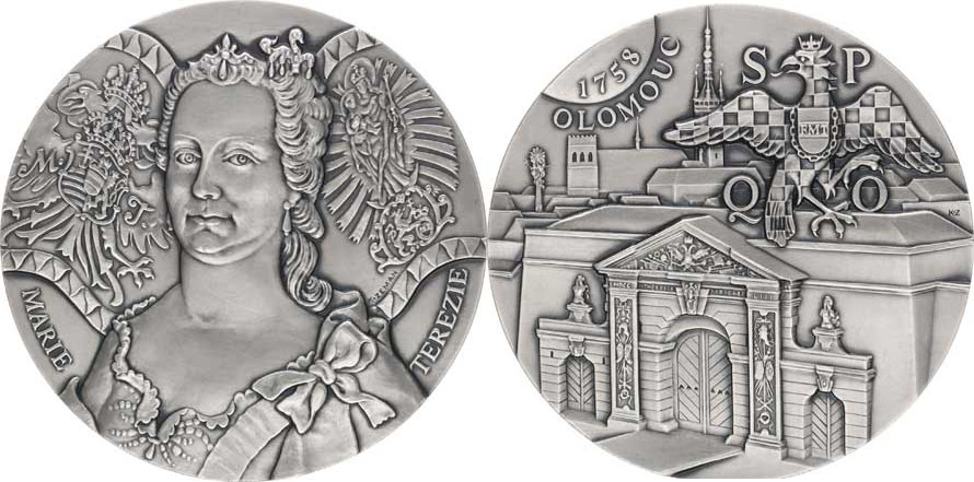Marie Terezie, portrét čelně / 260. výr. úspěšné obrany Olomouce 1758, Terezská brána, olomoucká orlice s datací patin. Ag 999 /1000 70 mm 159 g vydáno 70 ks certifkát č. 06 +číslo na hraně orig. etue /razila Mincovňa Kremnica 2019/