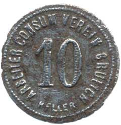 Grulich (Králíky) - 10 Heller b.l., Arbeiter Consum Verein Fe plech 20 mm, m. ox.