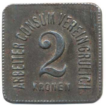 Grulich (Králíky) - 2 Kronen b.l., Arbeiter Consum Verein Fe plech 28x28 mm