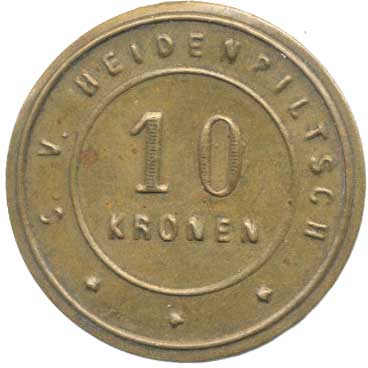 Heidenpiltsch (Bílčice okr.Bruntál), 10 KRONEN C. V. mosazný plech 31 mm