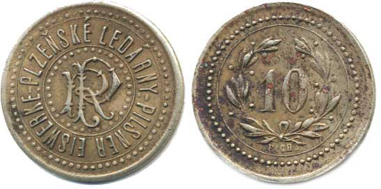 Plzeň - Plzeňské ledárny, česko-němec. nápisy / "10" v otevř. věn ci sign.: Pichl mosaz. slitina 22,5 mm