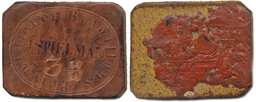 Reichenberg (Liberec) - J. Spielmann, Privatdiener. Bataillon - 3 krejcar vídeňské měny kůže 37x29 mm - na rubu pečeť