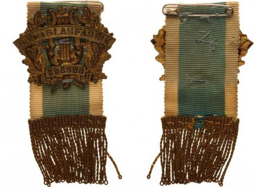 Krásná (okres Cheb) - G. V. der Glasfabrik, Na lyře dvě stužky s nápisy, po stranách dubové větvičky bílo-modro-bílá stužka s tř ásněmi bronz 41x32 mm