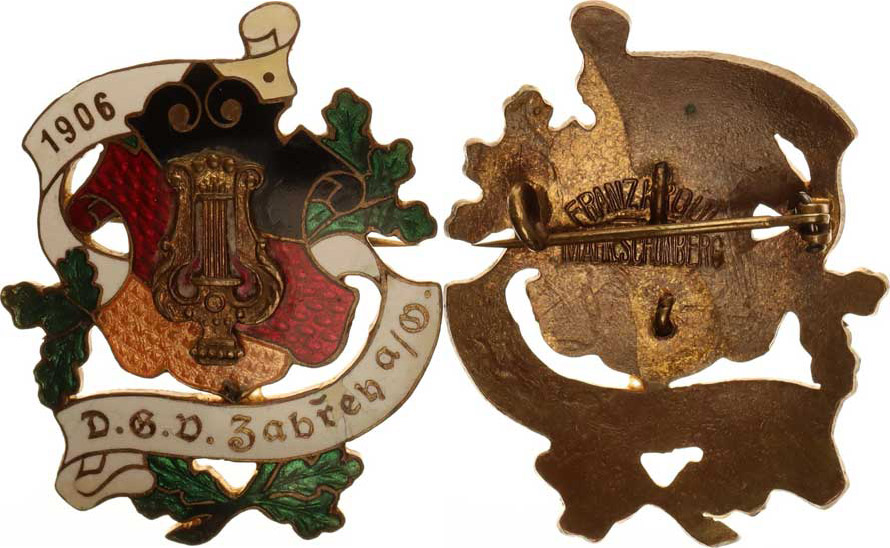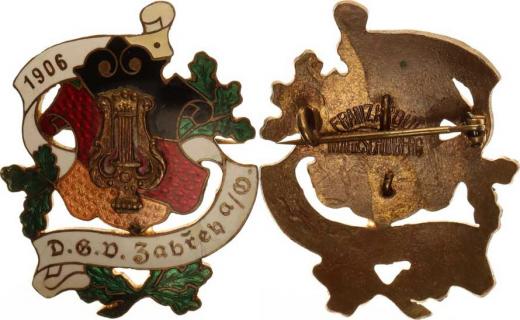 Zábřeh a/O. (nad Odrou) - Zlatá Lyra na černo-červ.-žlutém štítu, po stranách zelené listy, v bílé stuze nápis: 1906 D.G.V. Zabřeh a/O. výrobce: Franz Kroul Mähr. Schonberg 34x43 mm zapín. spona "R"