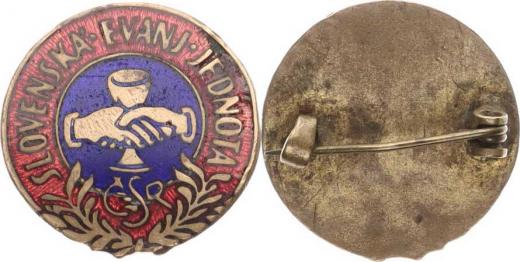 "Slovenská evanj. jednota ČSR", ruce v pozdravu s kalichem, opis červeno-modrý smalt 20 mm zapín. spona, nep. poškoz. smalt