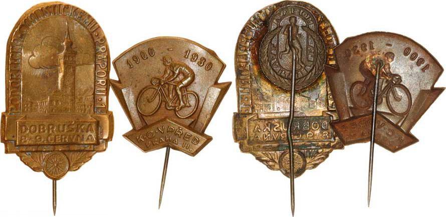 Dobruška - Podorlicko cyklistickému praporu "1" 8.-9. června 1935 sign.: Pichl bronz.plech 28x41 mm, nepův. jehla 2/ Praha II. - "K.C. VPŘED" 1900-1930, jedoucí cyklista zleva bronz. plech trojúh. tvaru 29x29 mm jehlla