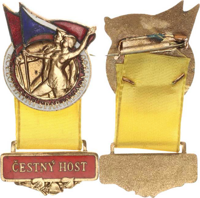 II. Celostátní spartakiáda 1960, barevný smalt 26 mm se zlatým st ředem, na malé žluté stužce červ. smalt. štítek s nápisem ČESTNÝ HOST