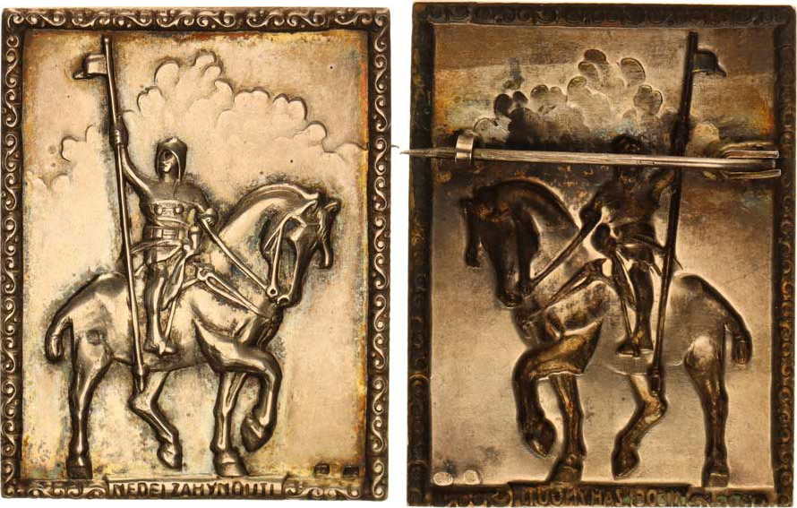 "NEDEJ ZAHYNOUTI" sv. Václav na koni, s praporcem v pravé ruce pod oblaky honosný odznak Ag 800 40x52 mm 11,664 g zapí n. sponka