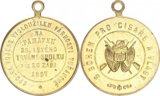 Spolek vojen. vysloužilen fárnosti Tuřanské - Na památku 25. leté ho trvání spolku dne 26. září 1897, šesti řádkový nápis +opis / V ojenské atributy a opis S BOHEM PRO CÍSAŘE A VLAST mosaz 31 mm orig. ražené ouško