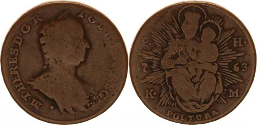 Poltura 1763 K-M +drobná růžice pod portrétem, Vídeň "R" Nov. 17 (cena T.C.)