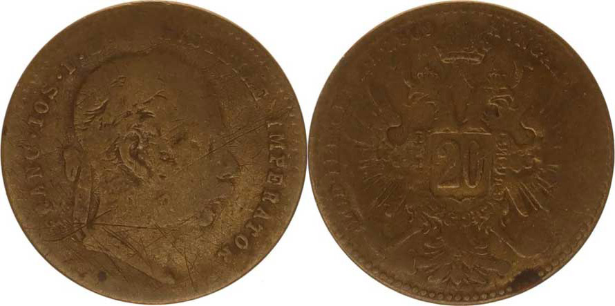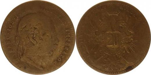 František Josef I.(1848-1918), 20 kr. 1869 b.zn. - mosaz (Moravec uvádí: nezaručený kus)