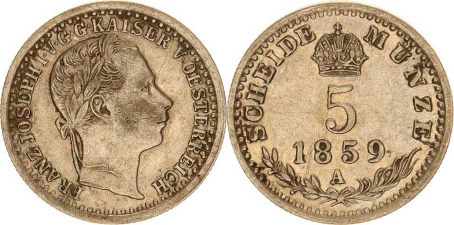 František Josef I.(1848-1918), 5 kr. 1859 A, tém.