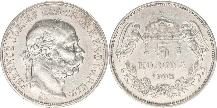 František Josef I.(1848-1918), 5 Koruna 1908 KB, vlas. rys., hr.