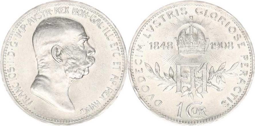 František Josef I.(1848-1918), 1 Koruna 1908 jubil. - tečka za HVNG.