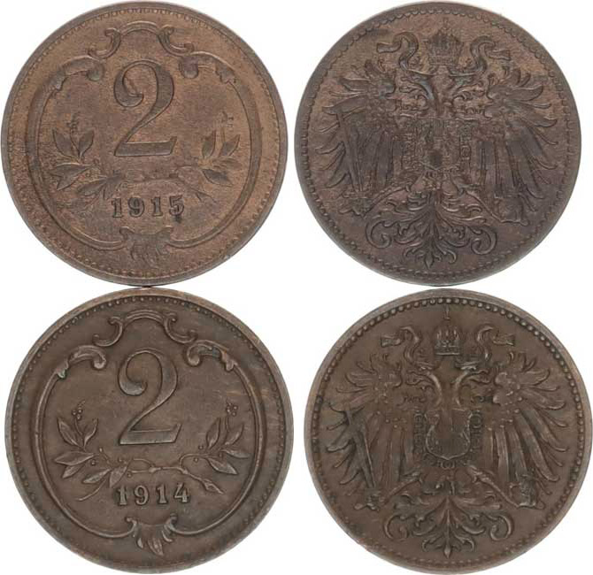 František Josef I.(1848-1918), 2 hal. 1914, 1915 oba b.zn.