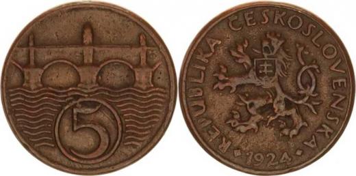 Údobí let 1918-1938, 5 hal. 1924 "Falzum" 2,673 g, tém.
