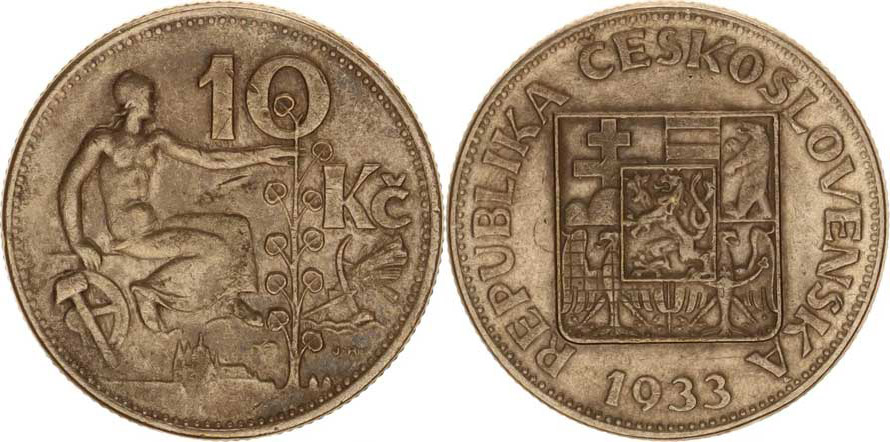 Údobí let 1918-1938, 10 Kč 1933 "Falzum" 11,478 g , patinovaný kov