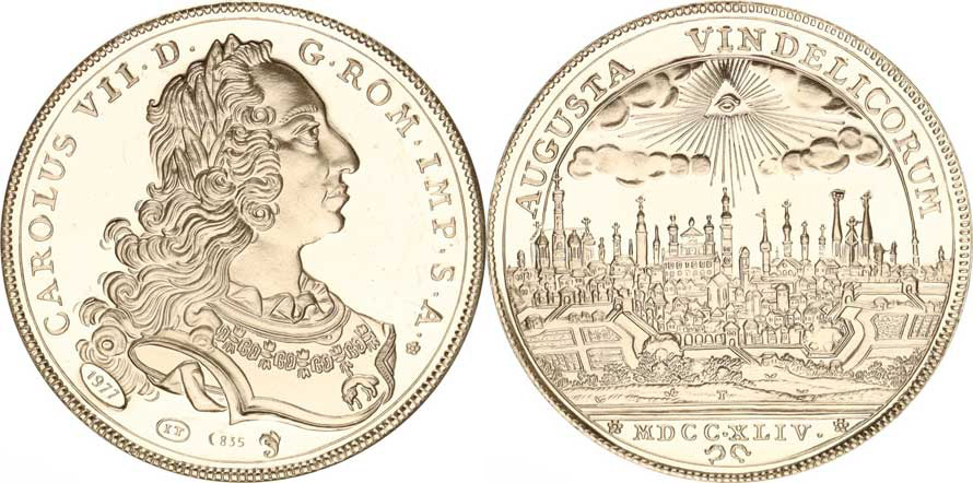 Augsburg - město, Tolar MDCCXLIV (1744) IT, pohled na město / Poprsí cís. Karla VII