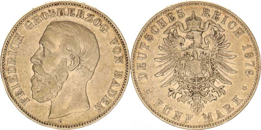 Baden, Friedrich I. (1852-56-1907), 5 Mark 1876 G KM 263,1