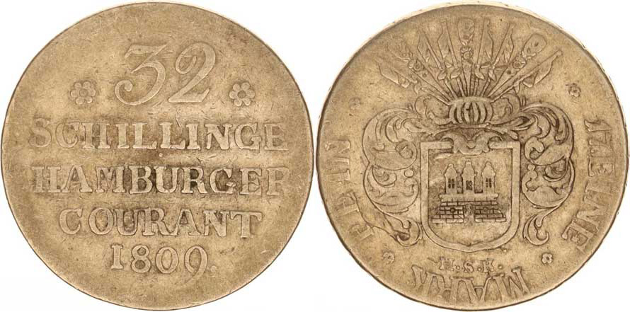 Hamburg, 32 Schilling 1809 H.S.K. KM 241 "R", tém.