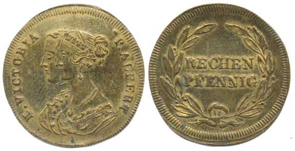 Početní žeton b.l. (pol. 19.stol.), dvojportrét královny Viktorie a prince Alberta / mezi dvěma vavřín. větvičkami nápis RECHEN PFE NNIG mosaz 23 mm