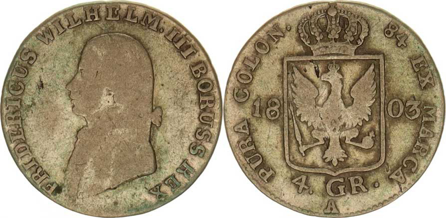 Prusko, Friedrich Wilhelm III.(1797-1840), 4 Groschen 1803 A KM 370,1 var. velká perla v koruně