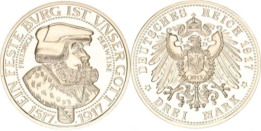 3 Mark 1917 E - Friedrich der Weise, výr. reformace KM 1276 značená novoražba "2001" Ag kapsle