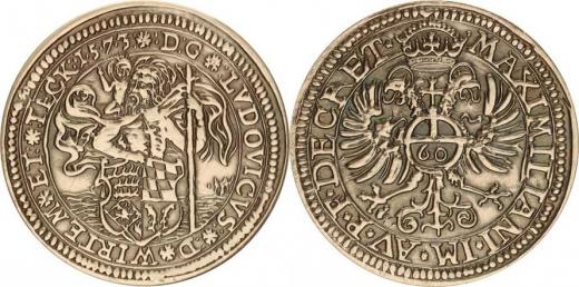 Güldensthaler 1573, Johann Christoph Berndt [rytec] - s tit. Maxi miliana "REPLIKA" na hr.: WURTT.LANDESSPARKASSE patin. Ag 1000 24,00 g