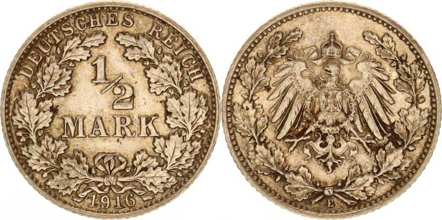 Německo, drobné ražby císařství, 1/2 Mark 1916 E