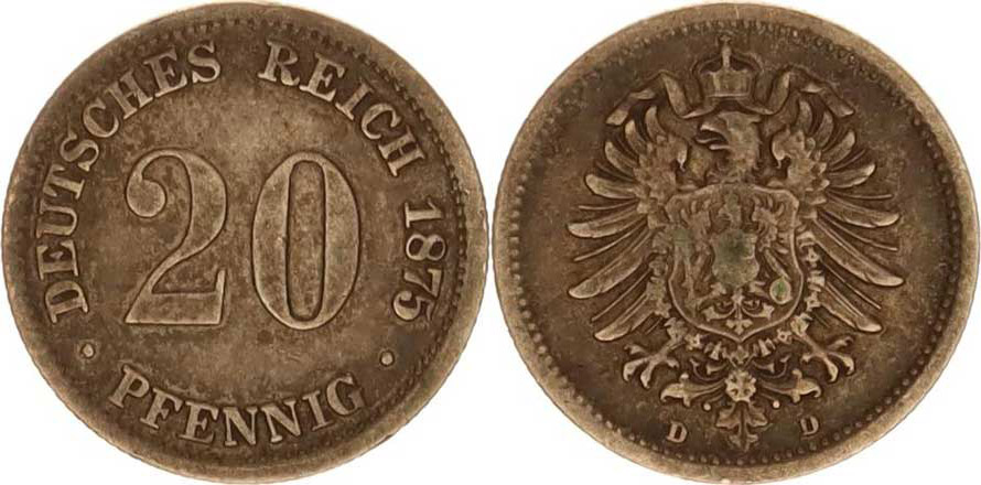 Německo, drobné ražby císařství, 20 Pfennig 1875 D