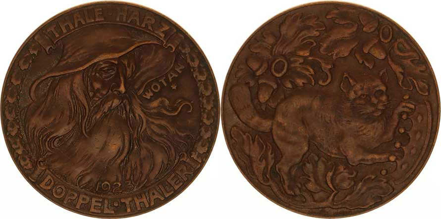 Německo, Nouzová platidla, Harz - Doppel Thaler 1923, Wotan / kočka bronz 38 mm