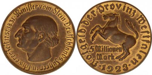 Německo, Nouzová platidla, Westfahlen - 5 Millionen Mark 1923, Stein Cu zlacené 44 mm