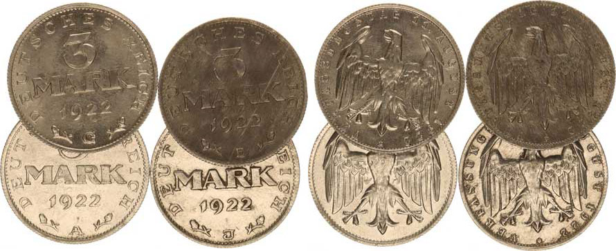 Výmarská republika (1918-1933), 3 Mark 1922 A, E, G, J - výr. konstituce KM 29 4 ks
