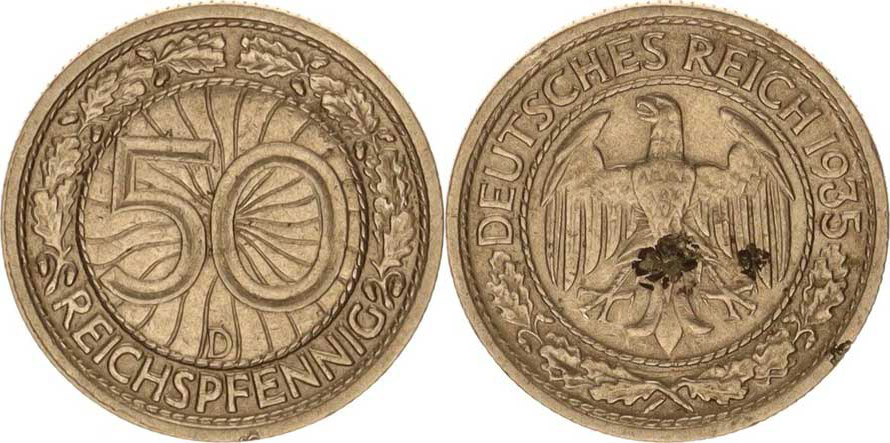 Výmarská republika (1918-1933), 50 Rpf. 1935 D KM 49, flíček