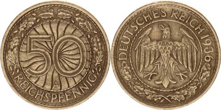Výmarská republika (1918-1933), 50 Rpf. 1936 A - Ni KM 49, patina