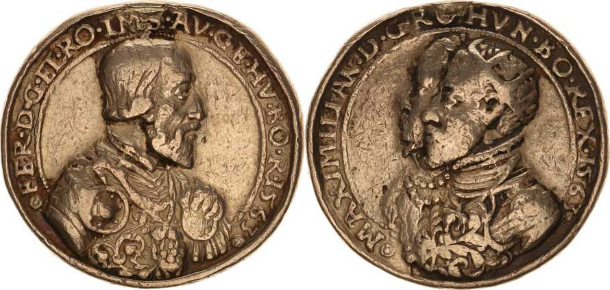 Medaile 1563, korunovace na uherského krále v Bratislavě portrét Ferd. I. a datace 1563 / dvojportrét Maximiliana a Marie, datace 1563 Ag 34 mm 19,939 g Novák II/D/6/b; Mont . 616 +starý podlož. štítek, měl ouško
