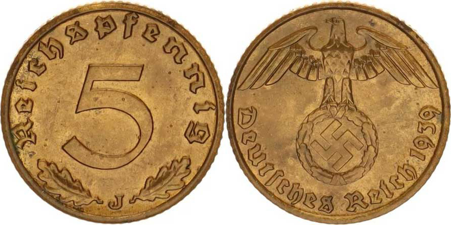 Německo - 3 říše, 1933-1945, 5 Rpf. 1939 J, lak.