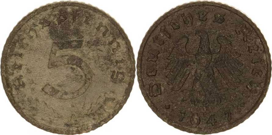 Německo - spojenecké obsazení (1945-1948), 5 Rpf. 1947 A "R" KM A 105, lak.