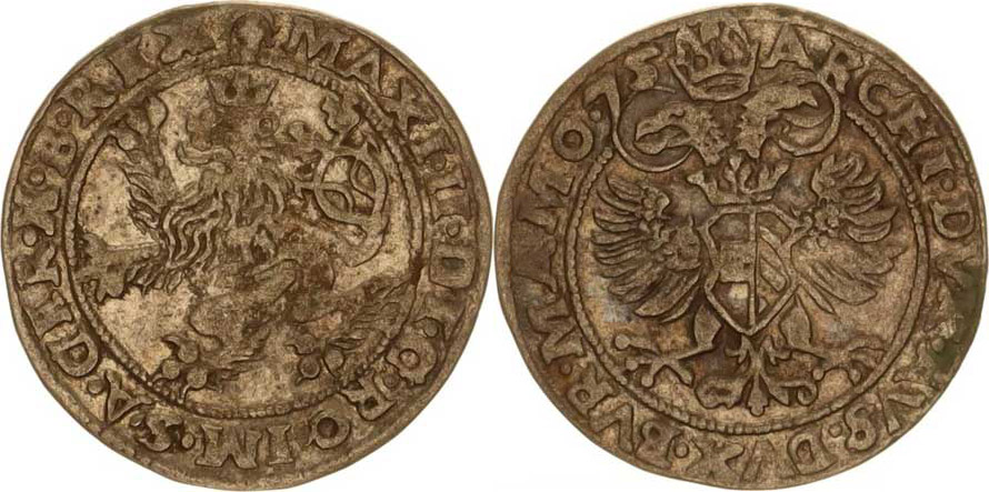 Maxmilian II. (1564-1576), Bílý groš 1575, Jáchymov-Geitzkofler zn. č.2, tém.