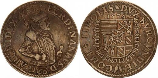 Ferdinand - arcivévoda (1565-1595), Zlatník (60 kr.) 1574, Tyroly Hall "RR" opis: FERDINANDVS. D
