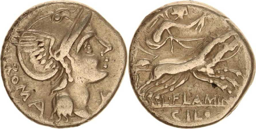FLAMINIA, L.Flaminius Chilo (109-108 př.Kr.), Denár, hlava Romy / Viktorie na bize Seaby 1; Cr. 302