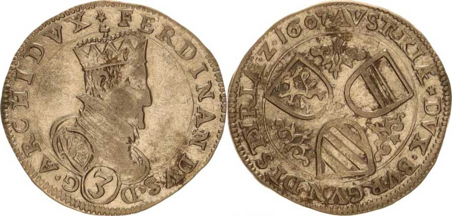 Ferdinand II. - arcivévoda (1592-1618), 3 kr. 1607, Štýrsko Graz "RR"