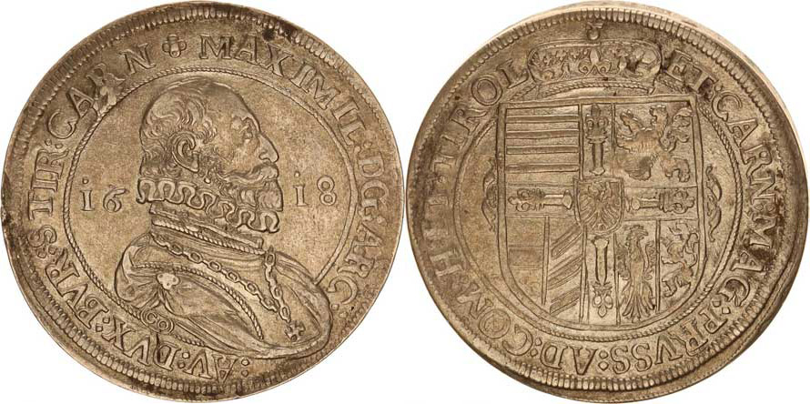 Tolar 1618 CO, Tyroly, Hall Voglh. 122/XIII var. jiná ozdoba n ad hlavou 28,318 g