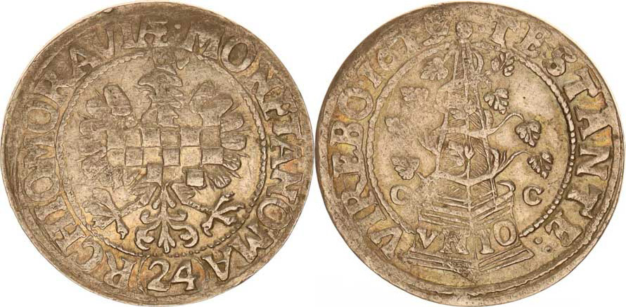 Moravské stavy (1619-1621), 24 kr. 1619 CC, Olomouc-Cantor MKČ 615 var.: paprsky mezi peří