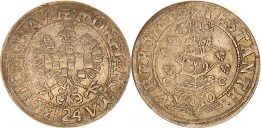 24 kr. 1619 CC, Olomouc-Cantor MKČ 615 var.: paprsky mezi peří m, tečka před MONETA, koruna pod písmem "RR" 8,318 g